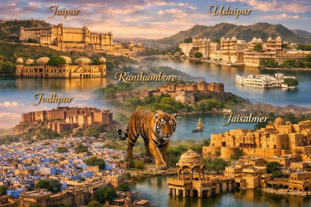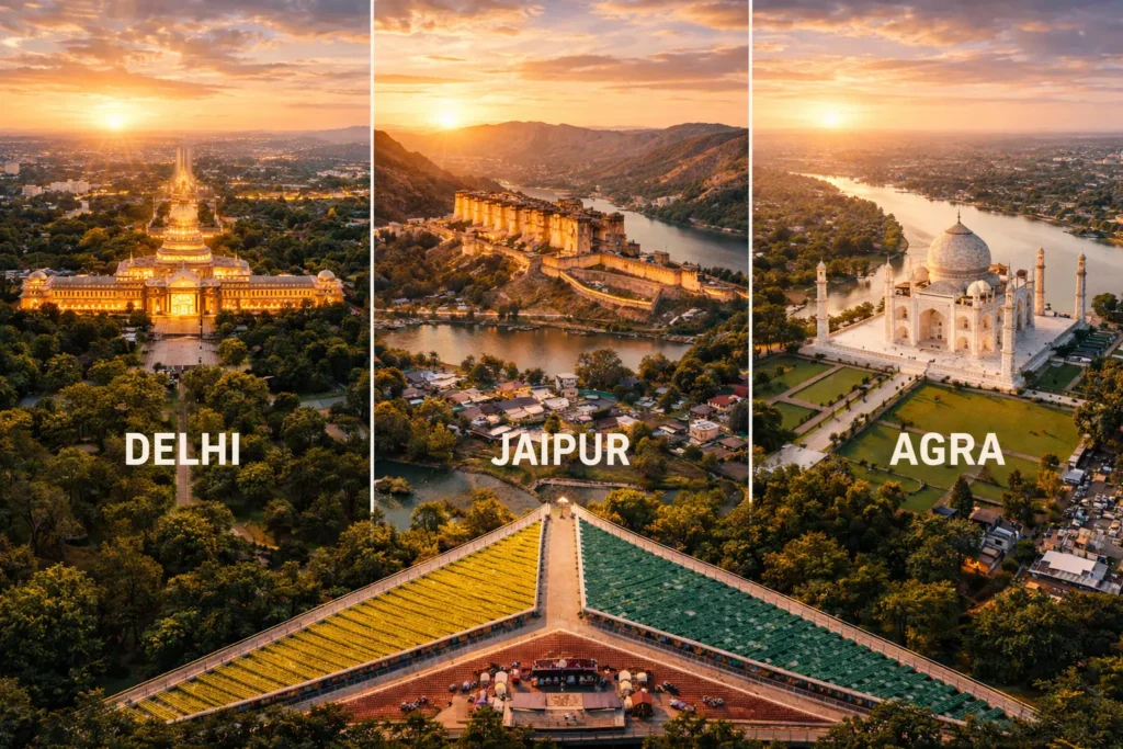 Most packages include Delhi, Agra, and Jaipur, with optional extensions to places like Ranthambore, Udaipur, Varanasi, Pushkar, Rishikesh, and more.